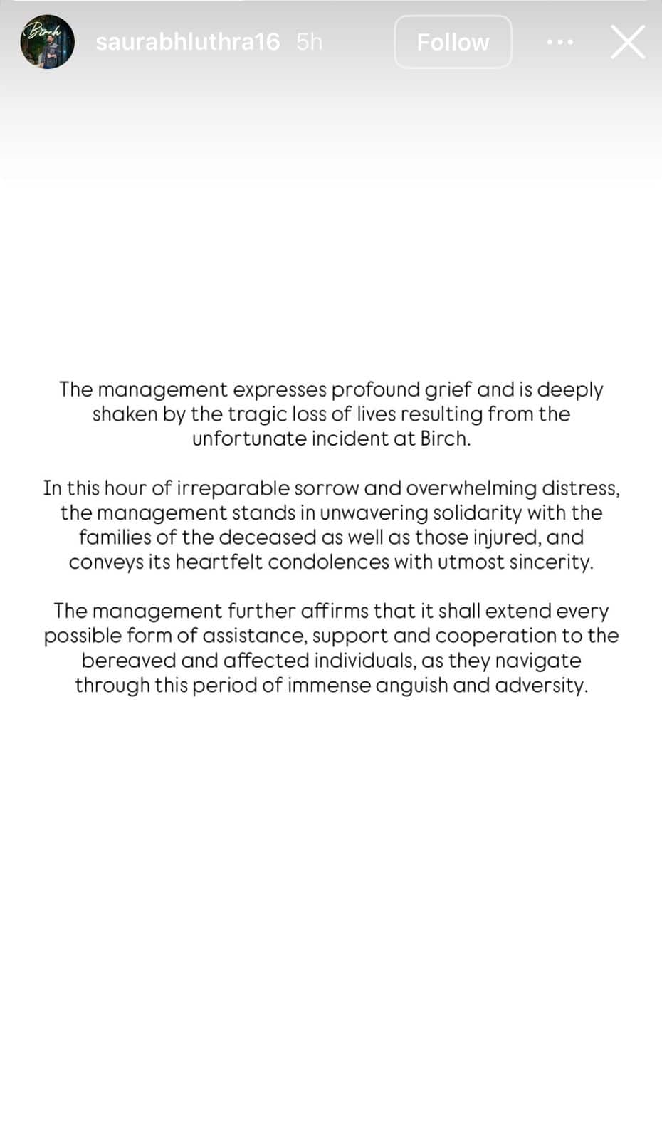 On Instagram, however, Saurabh Luthra issued a statement expressing “profound grief” and said the management was “deeply shaken” by the tragedy, adding that they would offer support to victims’ families “in every possible form”.